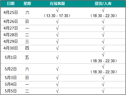 根據(jù)國家法定假日安排,結(jié)合我司運(yùn)營情況,勞動節(jié)假期服務(wù)安排如下: